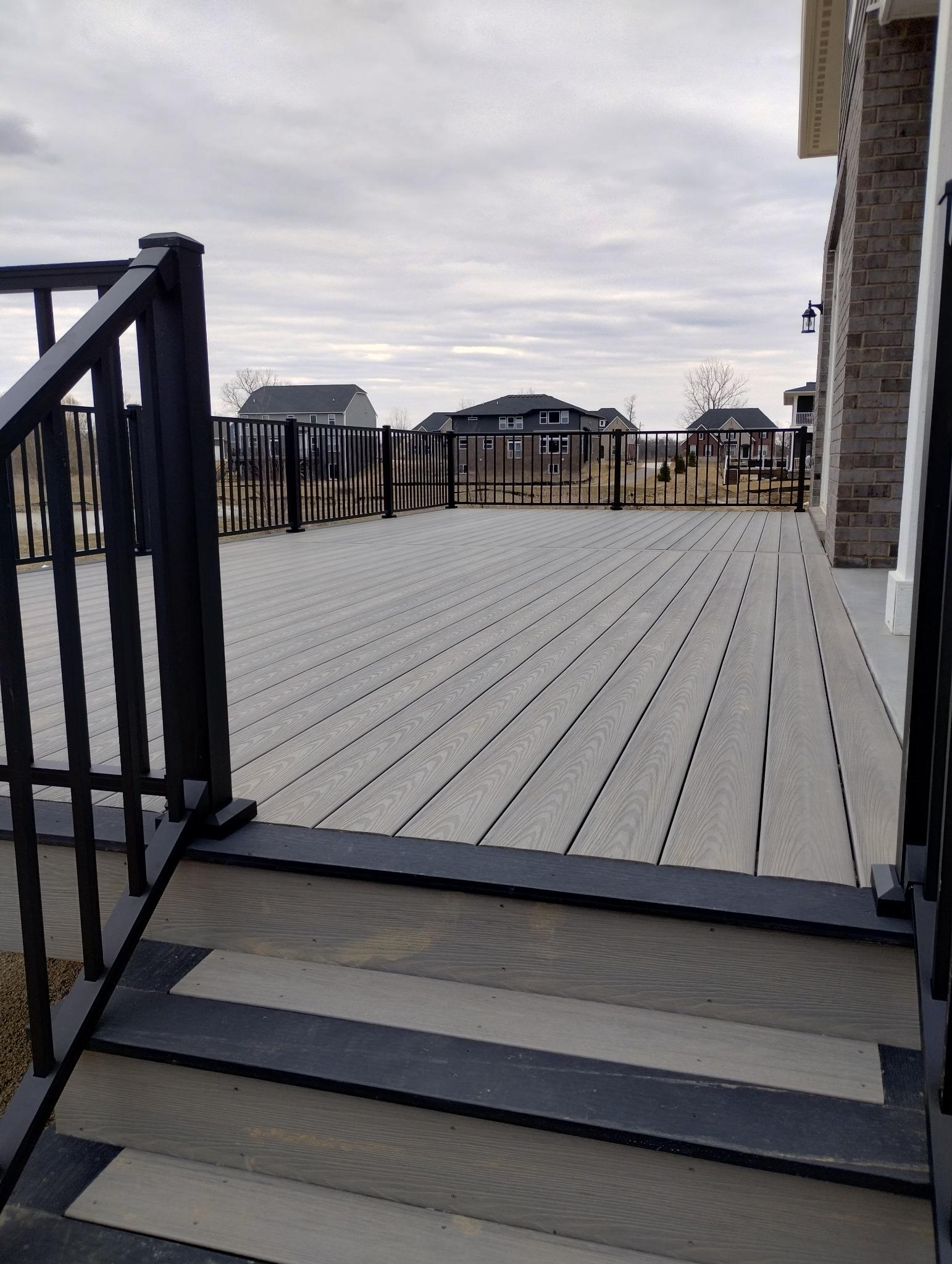 Composite deck in Windridge Estates, Lyon Township featuring Deckorators Summit decking, Dark Slate picture frame, and black aluminum railing.